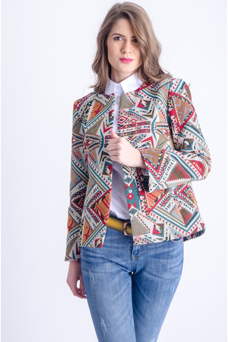 Optează pentru o jachetă dreaptă evazată, cu imprimeu jucăuș, care să aducă culoare ținutelor tale și să îți alungească vizual silueta.