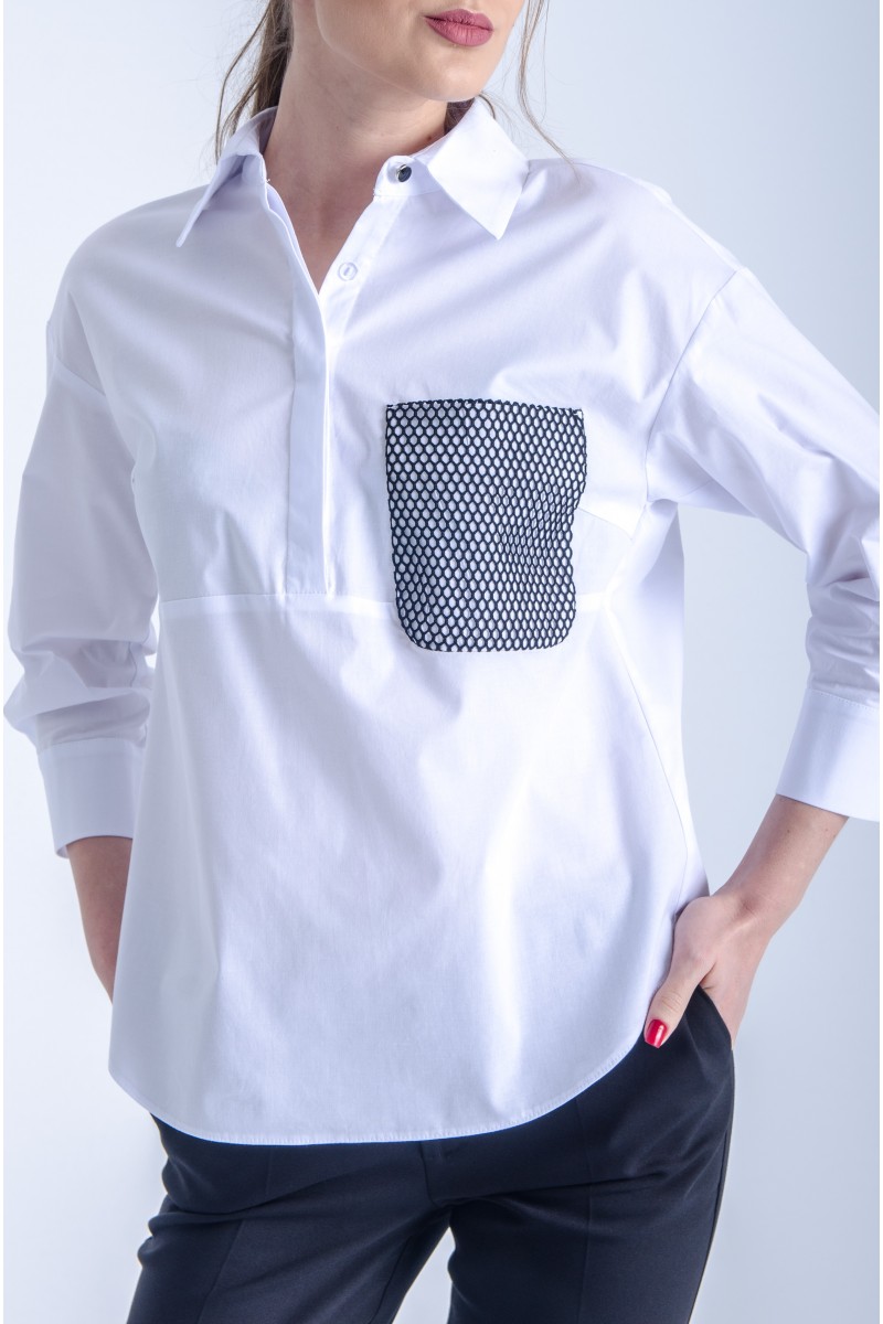 Opteaza pentru camasa Dorra, 119.90 lei, camasa oversize dreapta, cu buzunar accesorizat cu plasa. O poti mixa cu blugi de dama in acelasi stil, boyfriend, sau cu pantaloni mulati.