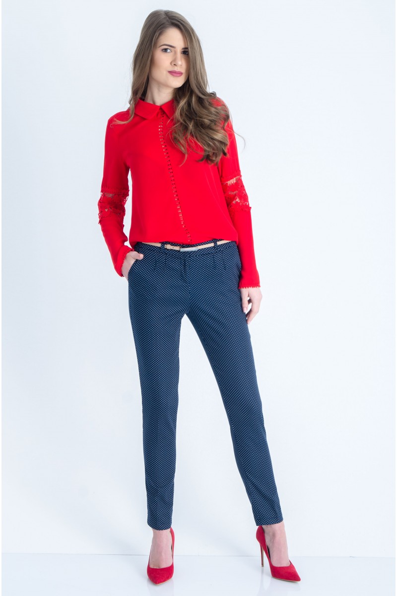 Una dintre tendintele pe care anul 2018 ni le aduce sunt tinutele elegante alcatuite din bluze si pantaloni. Fie ca participi la o zi de nastere, o intalnire romantica sau o iesire cu prietenele tale dupa o zi la birou, poti opta pentru o pereche de pantaloni conici pe care sa ii combini cu un maieu dintr-un material fin, delicat.